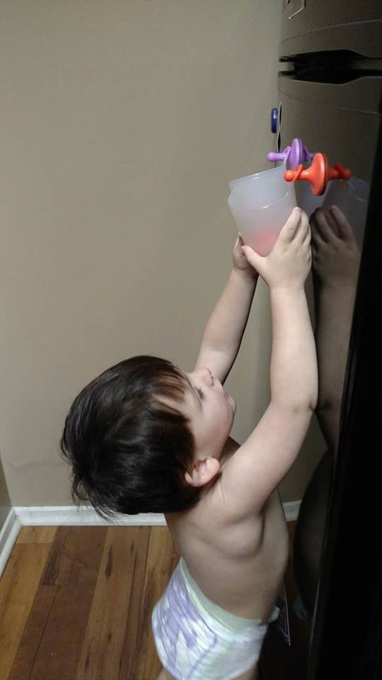 Now before I go on, another reason why I didn't jump at the first chance to buy these cups is that they ideally go on fridges that have exterior water and ice dispensers so the kids can grab a sip of water and then immediately hang their cup back up on the knob. Our stinky old apartment doesn't have a fridge with those (thank goodness because Bub would turn my kitchen into a lake everyday) so I was reluctant. BUT they still do me SO much good. Bub is just turning a corner with his talking skills (he isn't a big talker) and he often gets frustrated with himself when he knows what he wants but is having trouble relaying it to me. A lot of the time, he just wants a drink. Now he just does and gets his Puj cup and brings it to me. Communication problem solved. Clearly, he just wants a drink. Thanks for clearing that up for me dude.